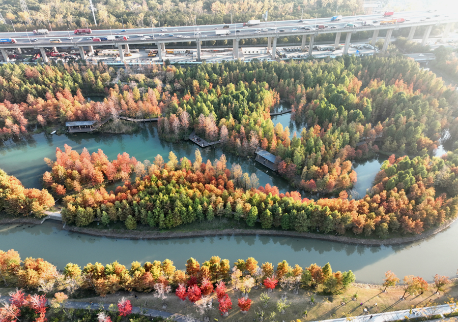 记者在现场看到,这里是上海中心城区罕见的杉林湿地景观。约10.7公顷的区域内,池杉、水杉、中山杉、东方杉等3500余株杉类植物高耸入云,其中近三分之一的树木直接生长在水中。眼下正值深秋初冬观赏期,红褐色的树冠与碧绿的水面交相辉映,偶尔还能看到几只小䴙䴘在水面徜徉,白鹭轻盈掠过树影婆娑的水面,一派生机盎然的自然野趣。